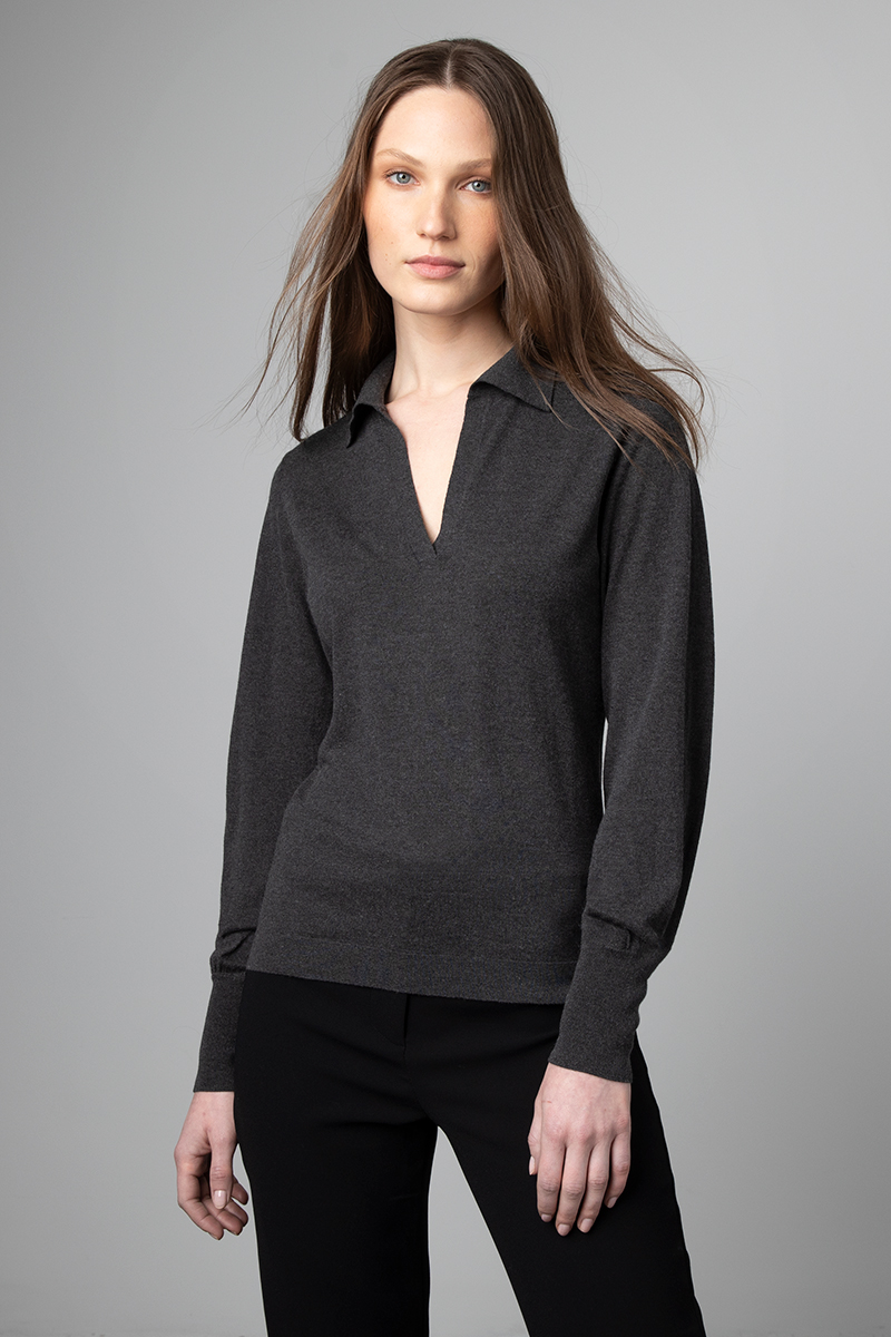 Fitted Polo Posted on January 20, 2022April 19, 2022 by Andy Bartmess KINROSS · Women's Cashmere / Silk - Fall 2022 · Fitted Polo LFSE2-277 – 85% Silk / 15% Cashmere – 16gg SKU: LFSE2-277 Category: Women's Cashmere / Silk - Fall 2022 Available Colors: Black Black Cherry Flannel Olive Related products Stripe T-Neck Read more Crewneck Read more Gathered Sleeve Scoopneck Read more Crop Button Cardigan Read more Previous: Gathered Sleeve Scoopneck Next: Crop Button Cardigan