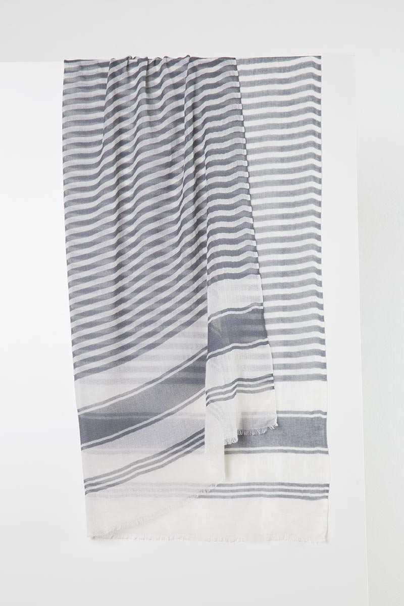 Printed Stripe Scarf – Sterling Posted on August 19, 2016November 6, 2017 by Andy Bartmess KINROSS · Women's Printed & Woven Scarves Spring 2017 · Printed Stripe Scarf – Sterling KA17-20S – 70% Cashmere / 30% Silk – Woven – 78″ x 36″ SKU: KA17-20S Category: Women's Printed & Woven Scarves Spring 2017 Available Colors: Bluewash Sterling Related products Brushwork Print Scarf – Sunrise Read more Wave Geo Print Scarf – Sunrise Read more Summer Ikat Print Scarf – Pebble Read more Printed Stripe Scarf Read more Previous: Printed Stripe Scarf